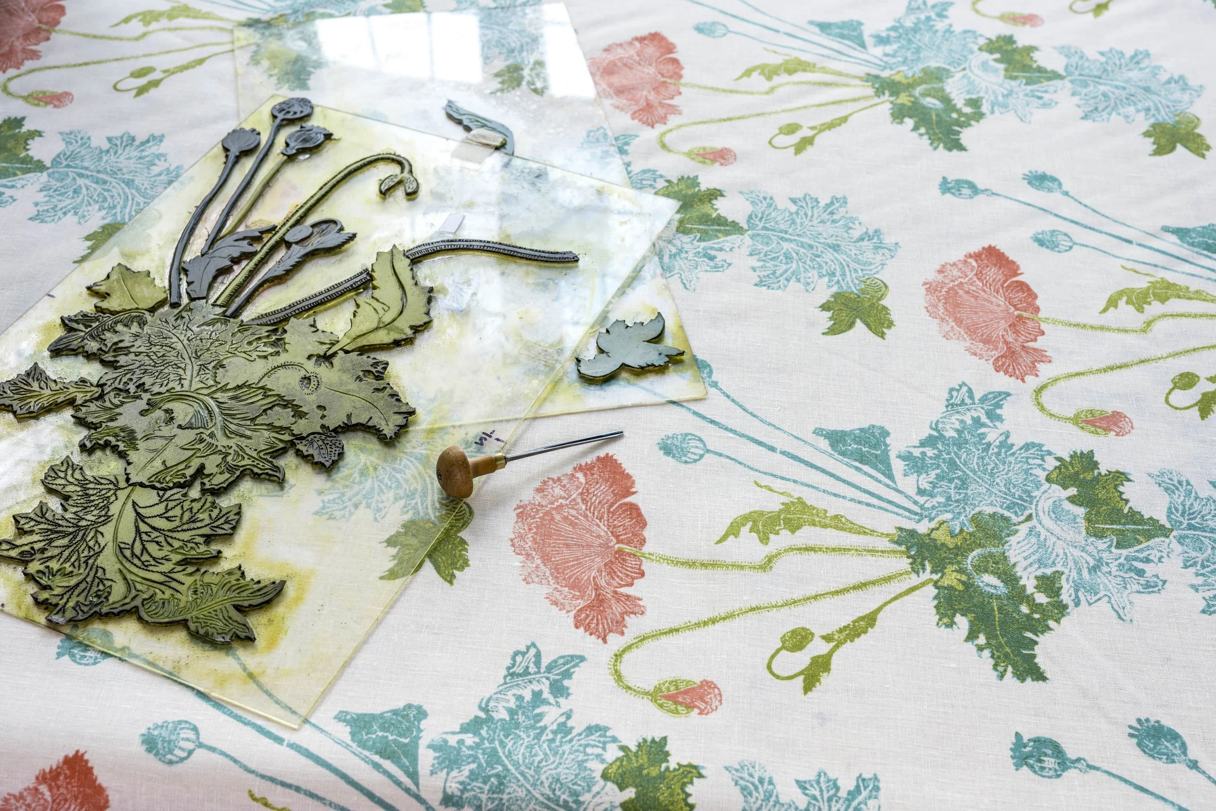 Jenny’s Poppy is an elegant representation of a Poppy in full bloom. The design bursts with life. Tall, generous blooms, flowing lines, patterns and textural details merge into a composition that feels both abundant and yet balanced. It was originally composed using a selection of previously carved blocks. Jenny rearranged and experimented with buds, blooms, leaves, and stems, allowing the pattern to evolve through movement, placement, colour, and layering. Jenny herself talks about this generosity and movement and a hopefulness that is produced by rhythm and repeat.